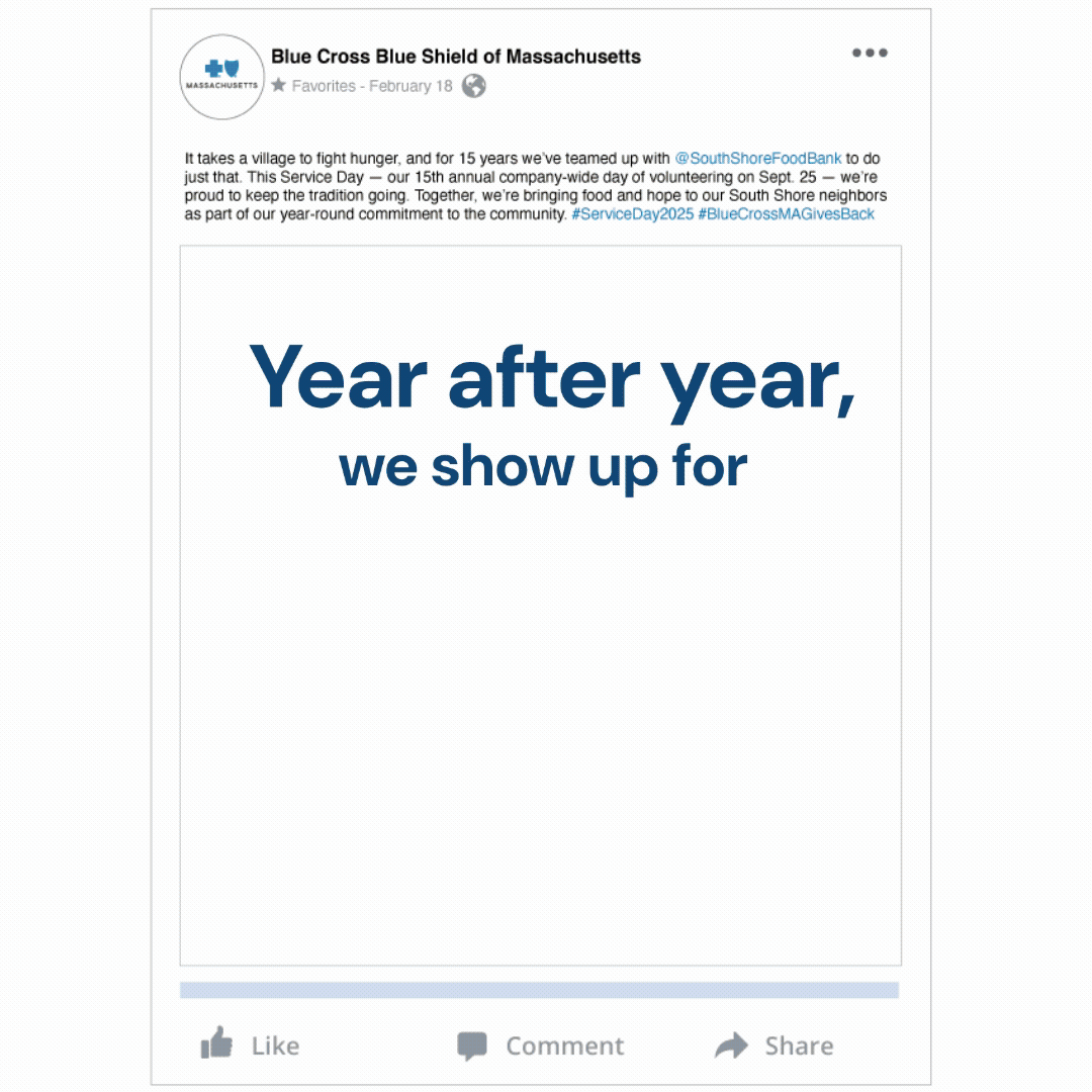 I played a central role in shaping the visual for the campaign to promote it, developing a variety of assets for internal and external audiences, including animated Facebook posts and Instagram reels, ensuring the tone was both celebratory and meaningful. The response was extremely positive, with associates and partner organizations appreciating how the design captured the essence of showing up and giving back.